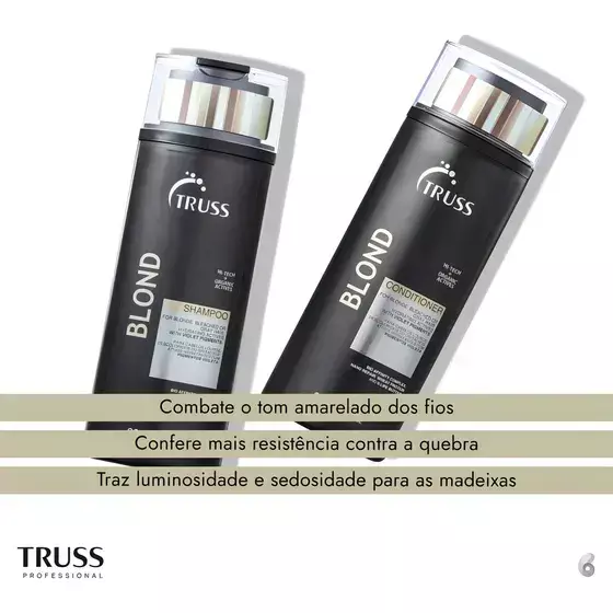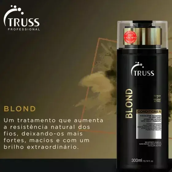 Após lavar os cabelos com shampoo, aplique o condicionador do comprimento às pontas. Deixe agir por 2 a 3 minutos e enxágue bem. Para melhores resultados, utilize em conjunto com a linha Truss Blond.